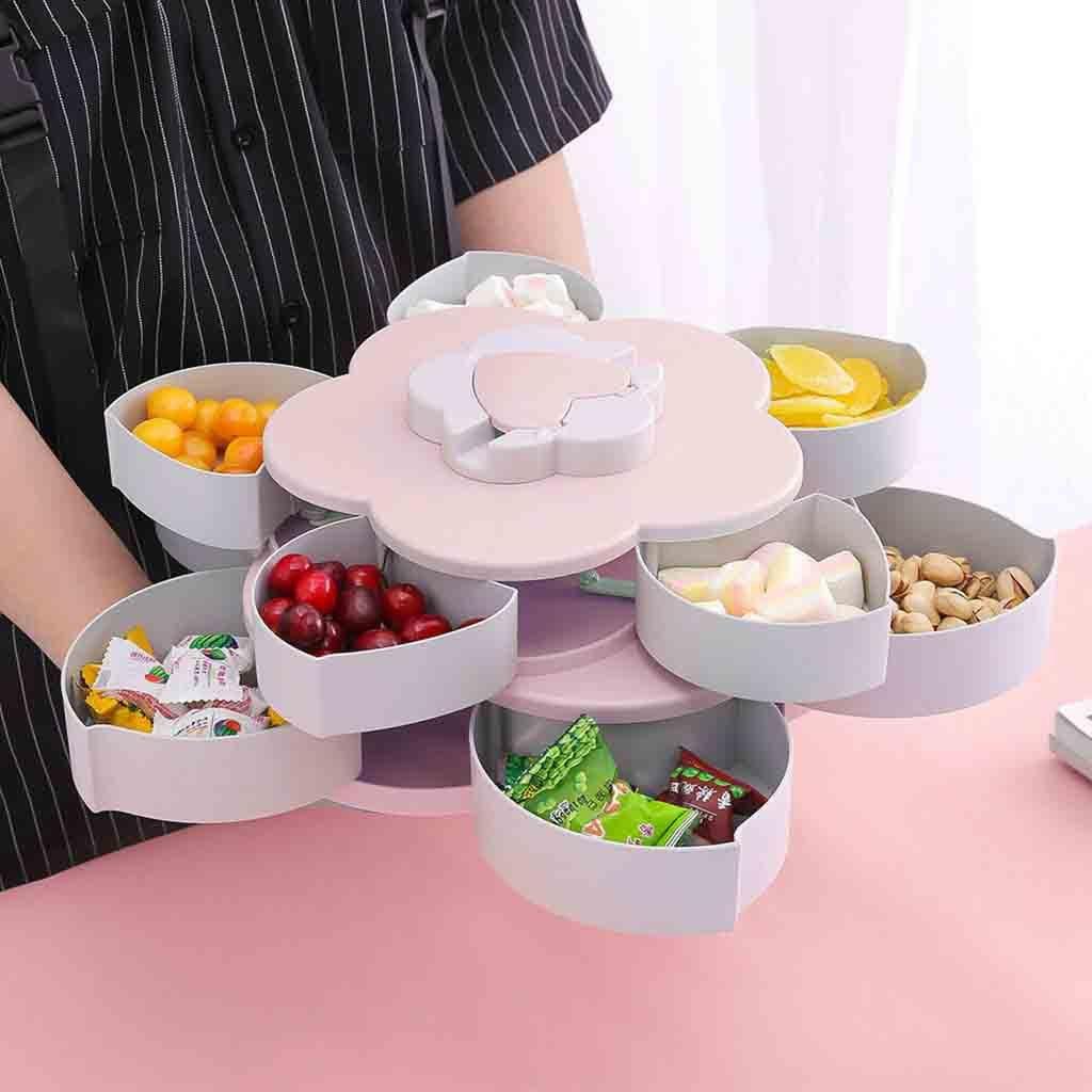 Description:Selected high quality food grade plastic material, healthy and environmentally friendly, safe and practical. The flower rotating candy box is designed to 10 compartments, can storage 10 kinds of snacks, rich in variety, and food storage is not mixed.Multi-functional storage design, flower rotating candy box can store dried fruits, nuts, candy, melon seeds, ornaments, etc. It can also be used as decorative accessories, wedding candy trays.Creative petal shape, like flower bloom, beautiful and stylish, rotating open cover design, conform to fashion and trend. Partition design, convenient for sorting and storage, save space when stacked, or can be used as a desktop storage tray.Features:We use food contact grade material, safe and healthyPetal-shaped separation design, which makes snacks and dried fruits better classified, does not mix flavorGently turn the switch on the top of the fruit bowl to open the fruit bowlThe bottom non-slip silicone design, with non-slip wear resistanceSpace to choose from, so that you have plenty of space and popular snacks. Meet your needs, family or friends have a personal love.Specification:Colors:Pink BlueCapacity: 12LSize: 140mmx 275mm/5.5 x 10.8inchPackage include:1x 2 Layer Flower Shape Rotating Candy Storage Box
