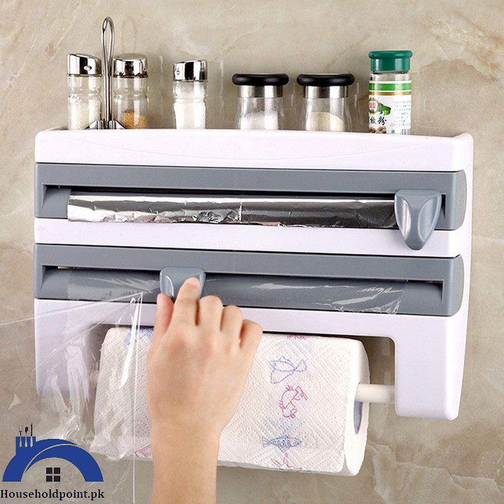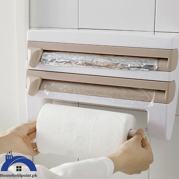 - Conveniently stores aluminum foil, cling film, and kitchen towels in one unit.