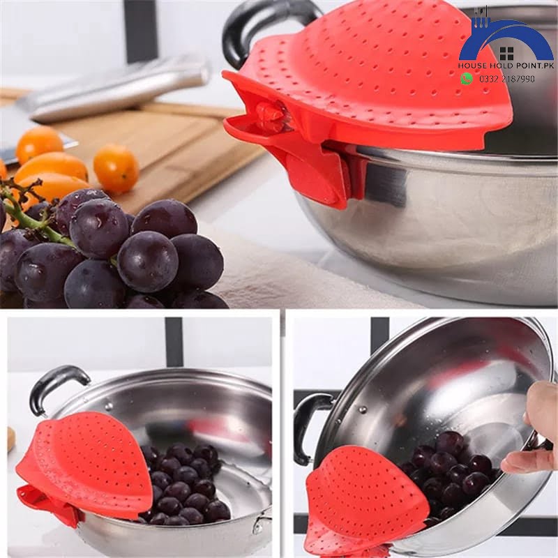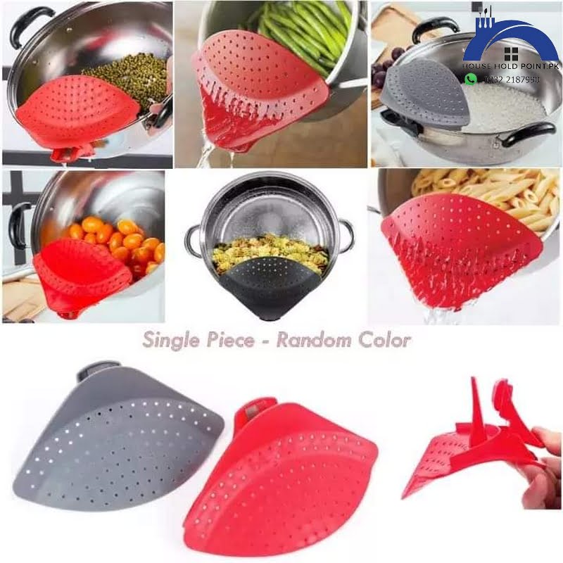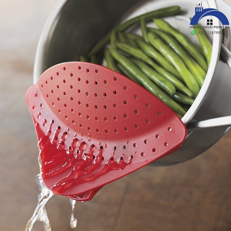 Buy Pot Drain Clip OnlineDescription:Clips on to most pots and pans using a metal reinforced clip with a non-scratch silicone gripper.Strong enough to stay in place while draining.Easier to store than a traditional colander.Dishwasher safe Drain board clampSpecifications:material: plasticColor: red, gray